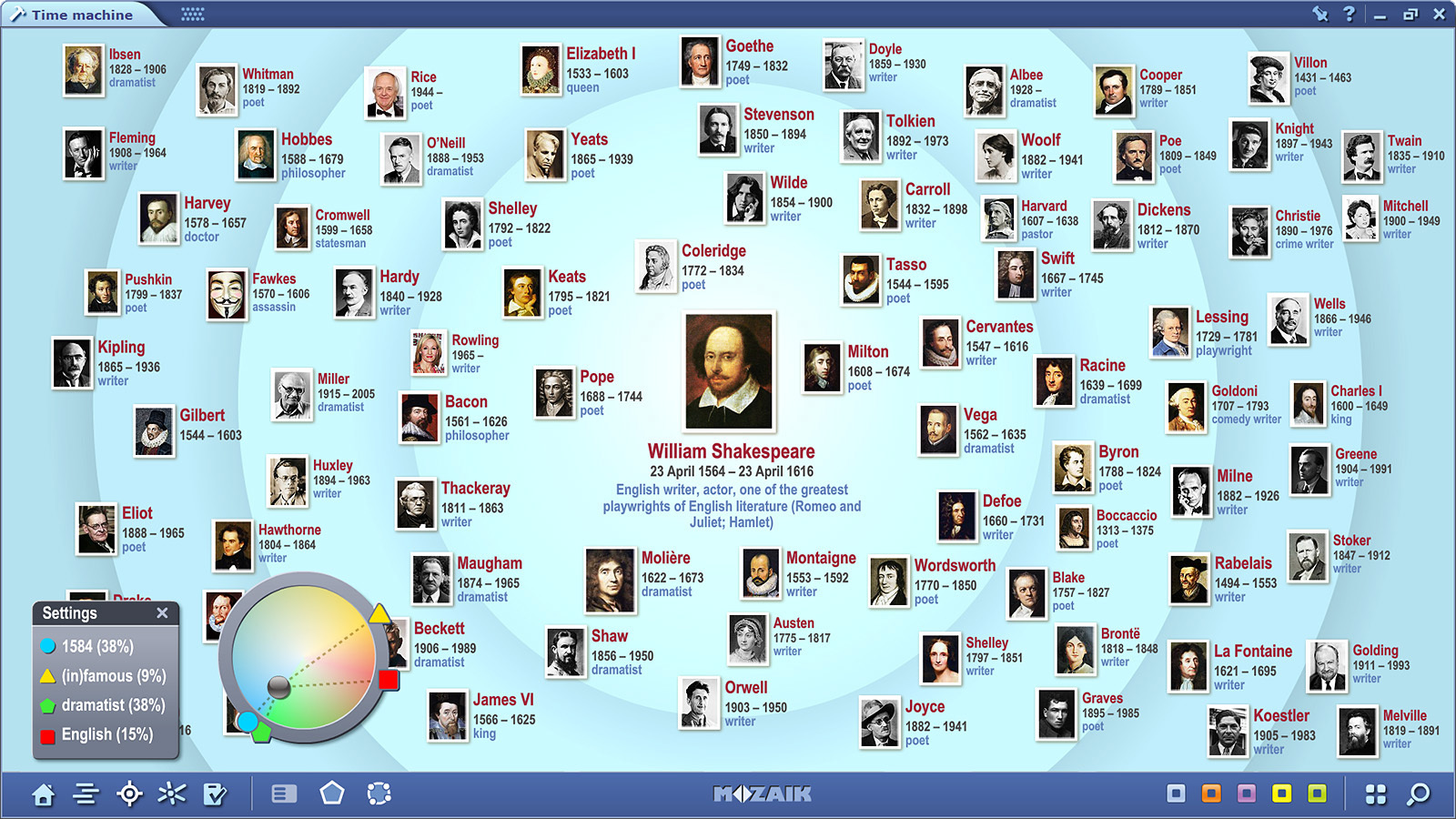 Here at Mozaik we are passionate about History and really want this wonderful subject to flourish in classrooms all over the world. One of the ways we are hoping our software can inspire students to learn history is our absolutely unique educational tool called “Time Machine”. Time Machine is designed to help students make connections between historical personalities according to their nationality, profession, date of birth and (in)famousness.