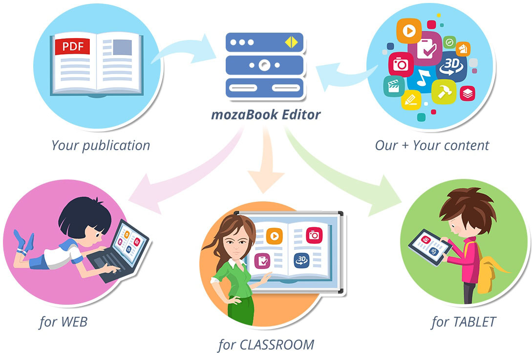 With the mozaBook presentation software, your users can open your enriched textbooks on interactive boards and PCs, using the built-in media players, they can play the books' interactive extra content smothly and even offline.